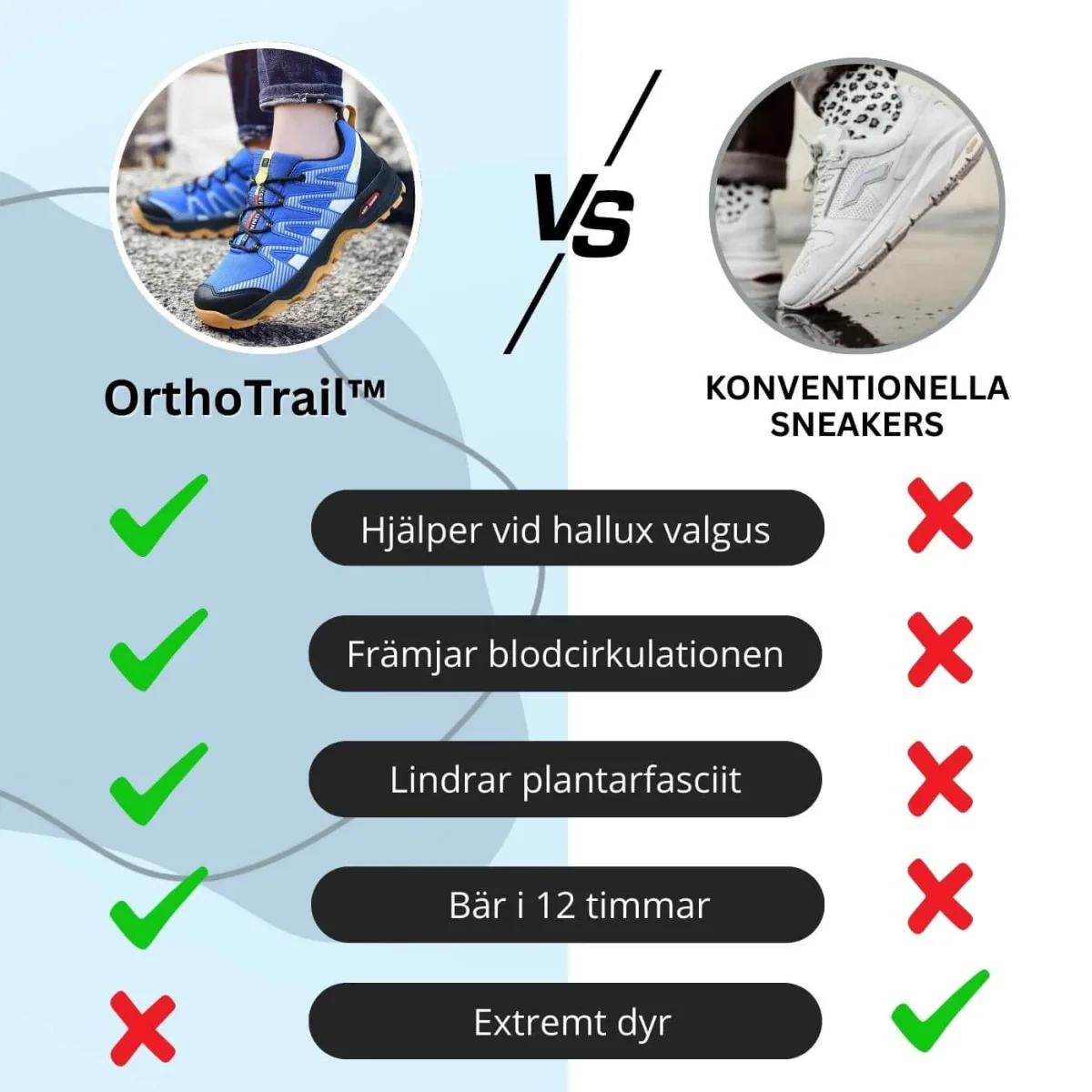 OrthoTrail™ är för dig som lider av ömma fötter varje dag. Oavsett om det är hälsporre, hallux valgus eller ledvärk ger skorna avlastning, dämpar smärtan och gör det lättare att gå längre. Perfekta för promenader, arbete eller vardagsbruk – du känner skillnaden direkt.