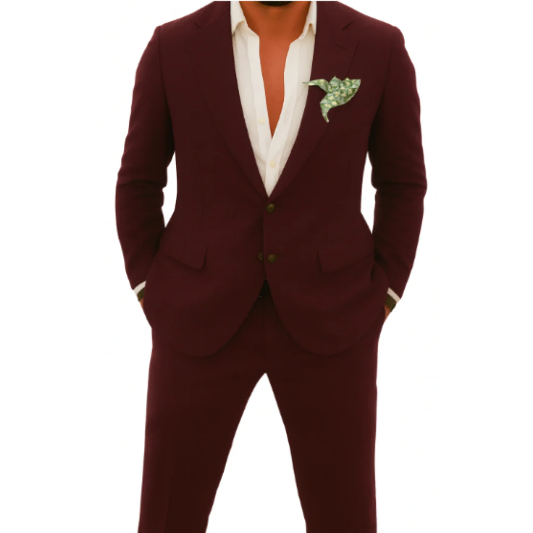 Denna tvådelade kostym består av kavaj och byxor i en enhetlig design. Den är anpassad för bröllop, event och tillfällen under varmare dagar. Delarna kan bäras tillsammans eller kombineras separat för olika outfits.