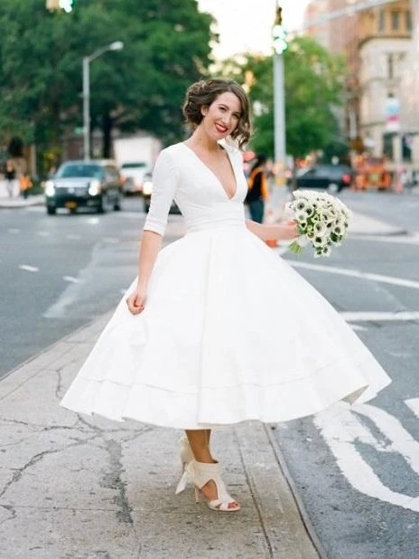 Djup V-ringad satin helcirkelkjol Te Längd Bröllopsklänning