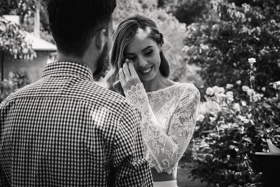 Casual långärmad spetstopp Boho Chiffong tvådelad bröllopsklänning.