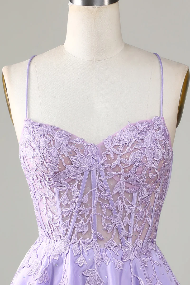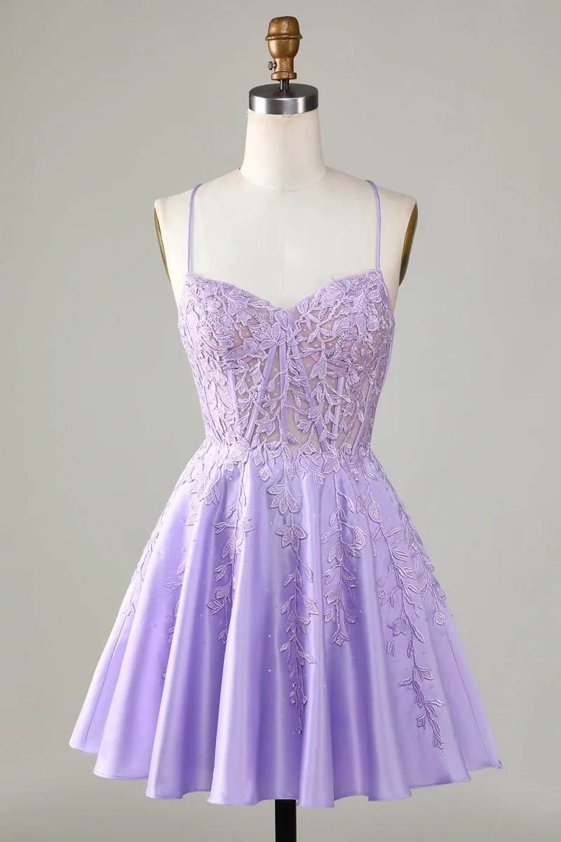 Turn heads at your next special occasion with this darling purple homecoming dress! The A line silhouette and corset bodice create a flattering fit for any figure. Delicate lace detailing adds a touch of romance and sophistication. Dance the night away in style and comfort!