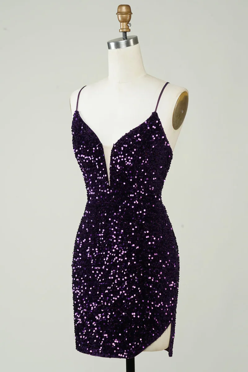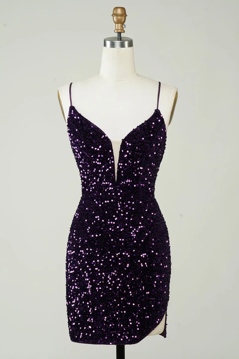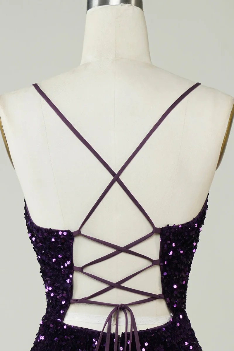 Shine bright at your next special occasion in this purple sparkly sequin homecoming dress. The backless design and tight fit will show off your figure, while the slit adds a touch of elegance. It’s the perfect choice for homecoming, prom, or any party where you want to make a statement. Feel confident and fabulous all night long!