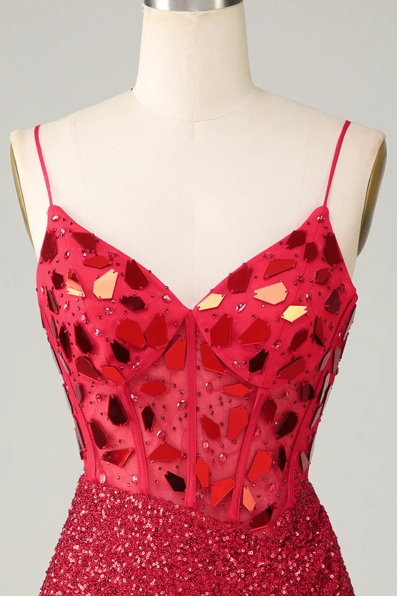 This dress is made to order. Our tailors craft each dress to order. The dress features a corset sequin mirror tight design. It’s perfect for homecoming events.