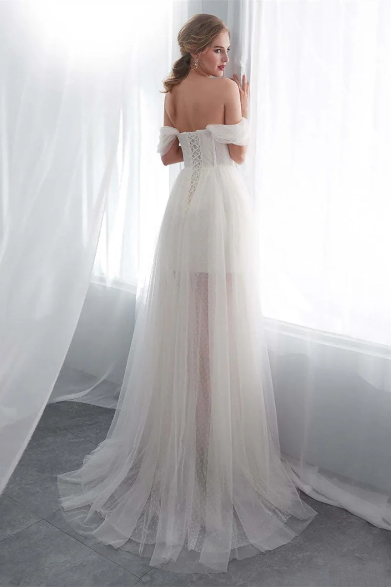 En off-shoulder-klänning med fina applikationer skapar en smickrande silhuett medan lätt benväv ger mjuk struktur och stöd. Flera lager av mjuk tyll skapar en luftig A-linjeformad kjol som rör sig graciöst för foton och dans. Osynlig dragkedja bak och ett färdigt foder säkerställer bekväm användning hela dagen. Professionellt färdiga sömmar och lättviktskonstruktion gör klänningen elegant utan extra bylsighet.