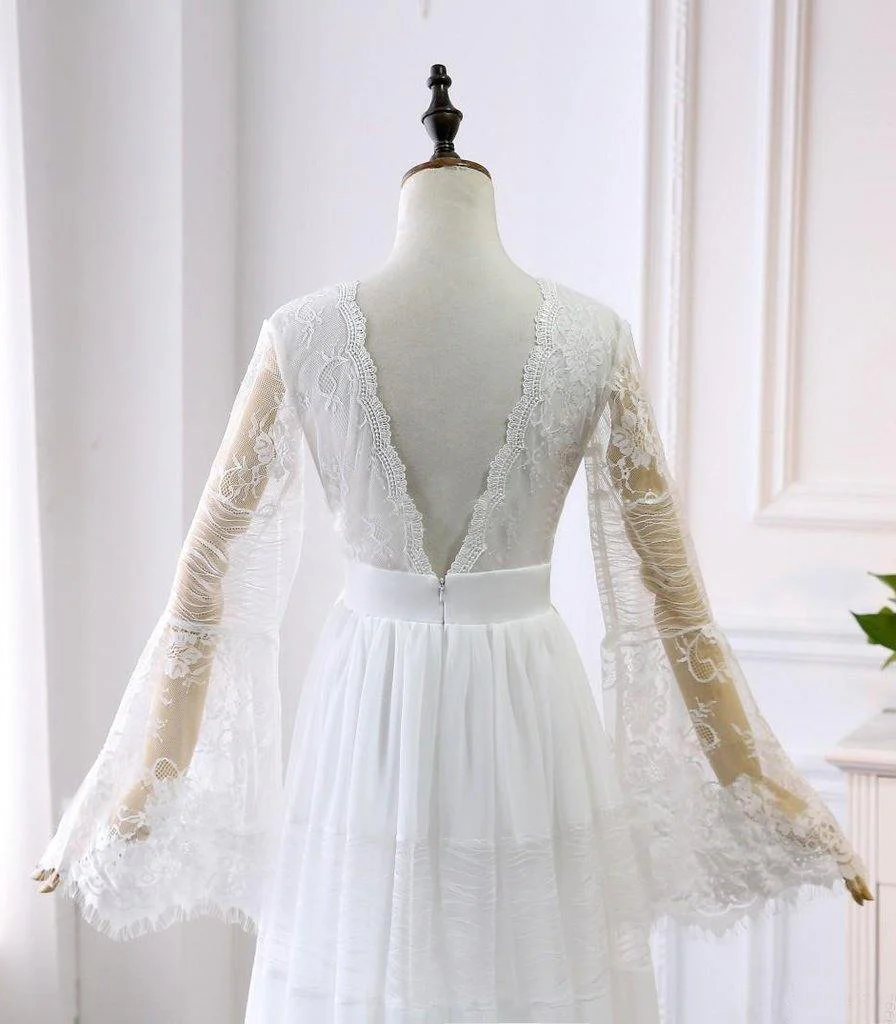 Casual Flowy Boho Spets V-hals Bröllopsklänning med trumpet ärmar
