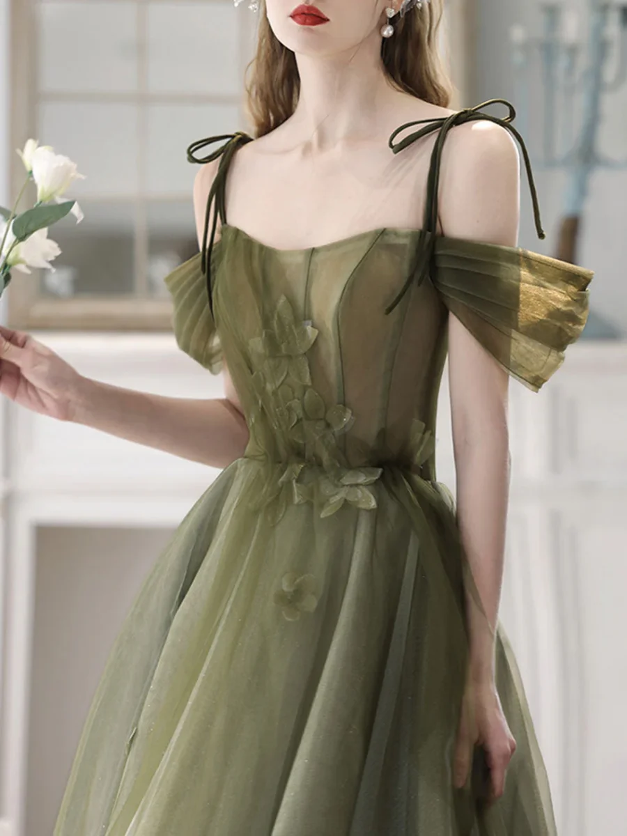 A-Line Off Shoulder Grön Tyll Lång balklänning, gröna högtidsklänningar
