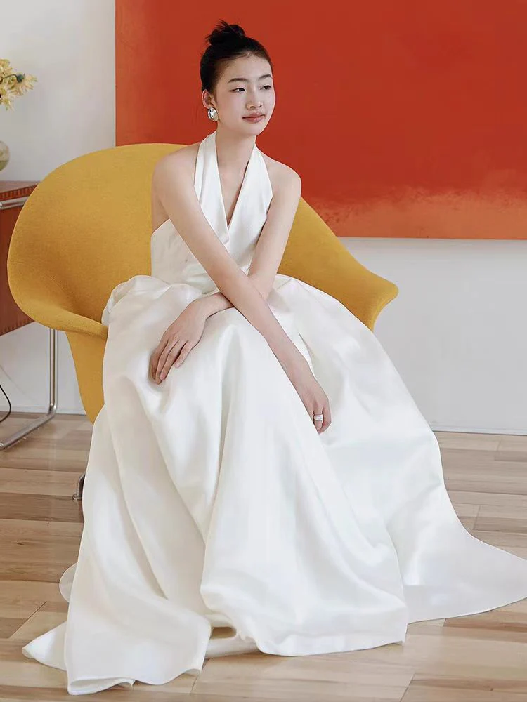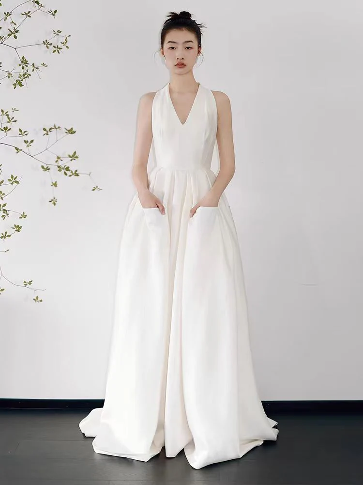 This simple halter V-neck wedding dress is made from 100% silk taffeta, combining elegance with modern practicality. The clean lines and flowing silhouette create a timeless look, while the halter neckline adds a touch of sophistication. Thoughtfully designed with hidden pockets, it offers both style and convenience, making it a perfect choice for brides who appreciate effortless charm with functional details.