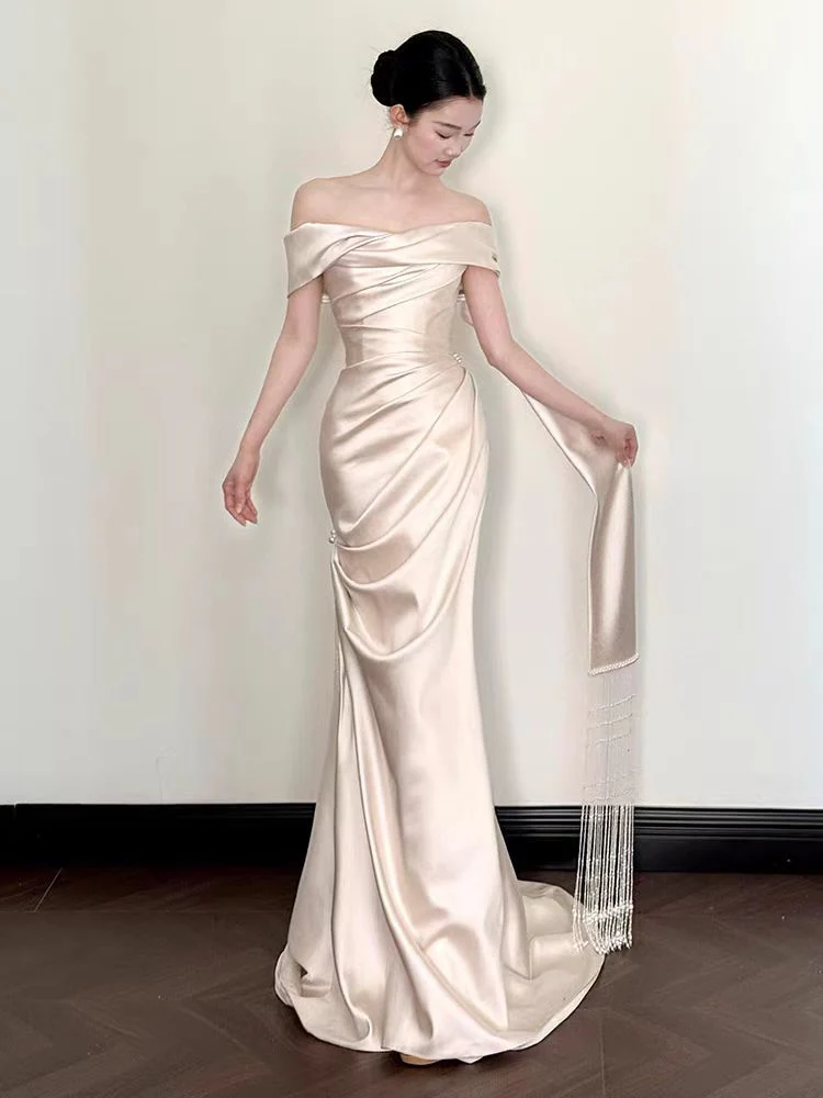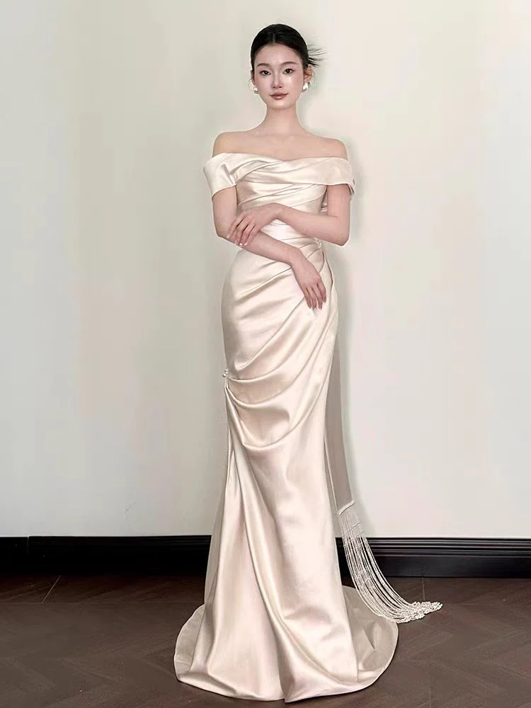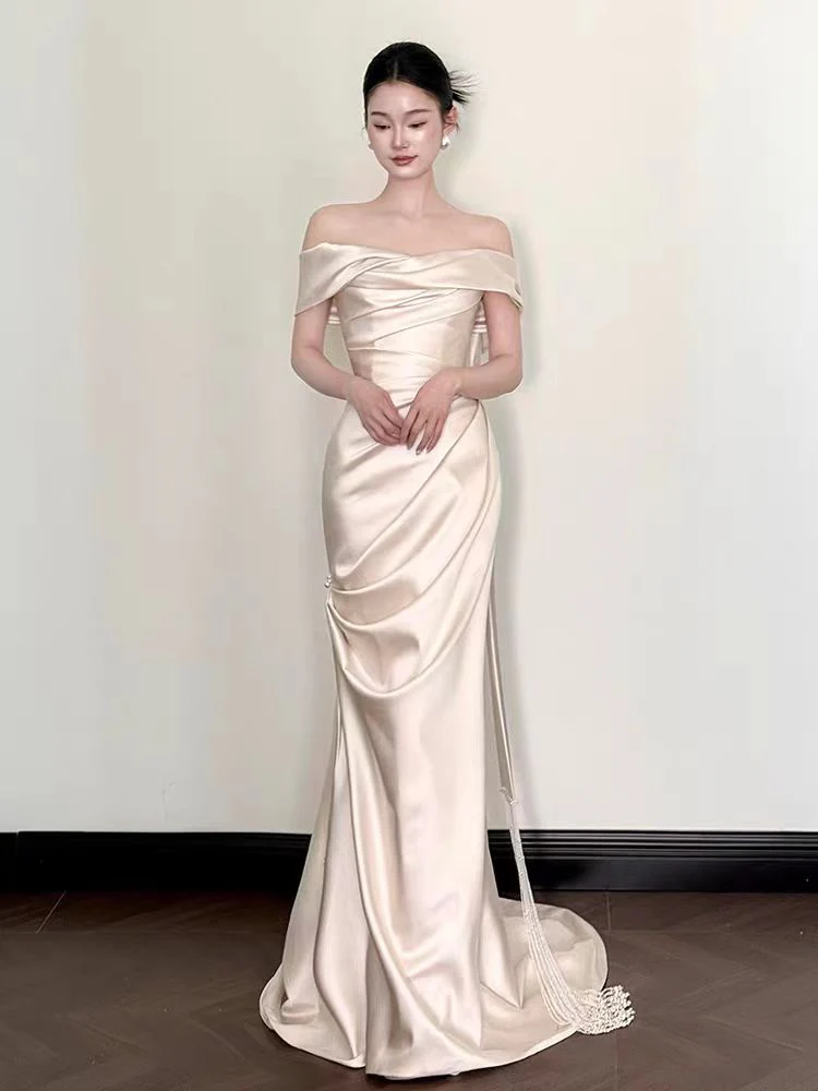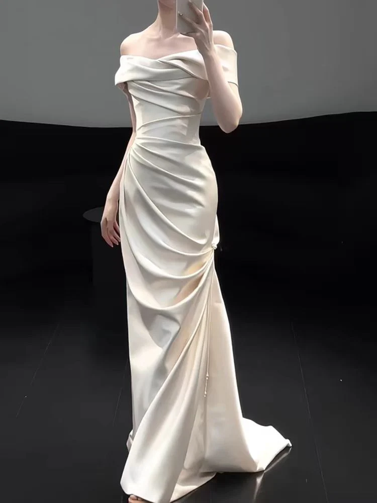 This simple off the shoulder wedding dress is crafted from luxurious 100% silk satin, featuring an elegant asymmetrical neckline and hem. Its minimalist design and soft, flowing silhouette create a timeless, modern bridal look with effortless sophistication.
