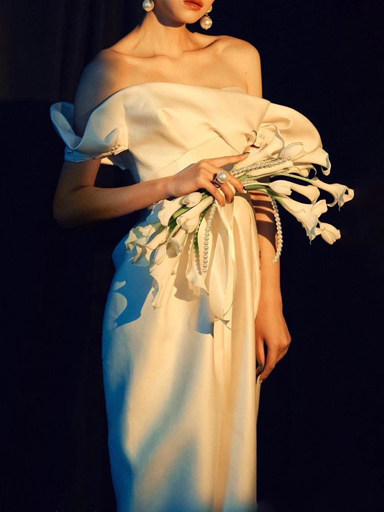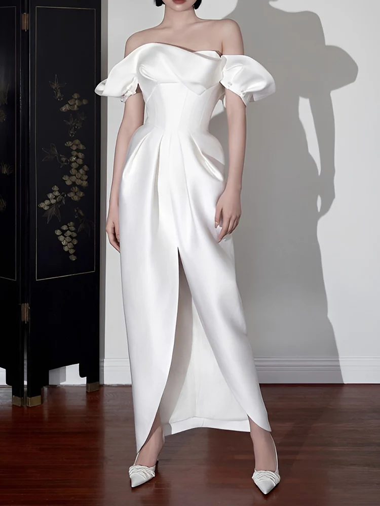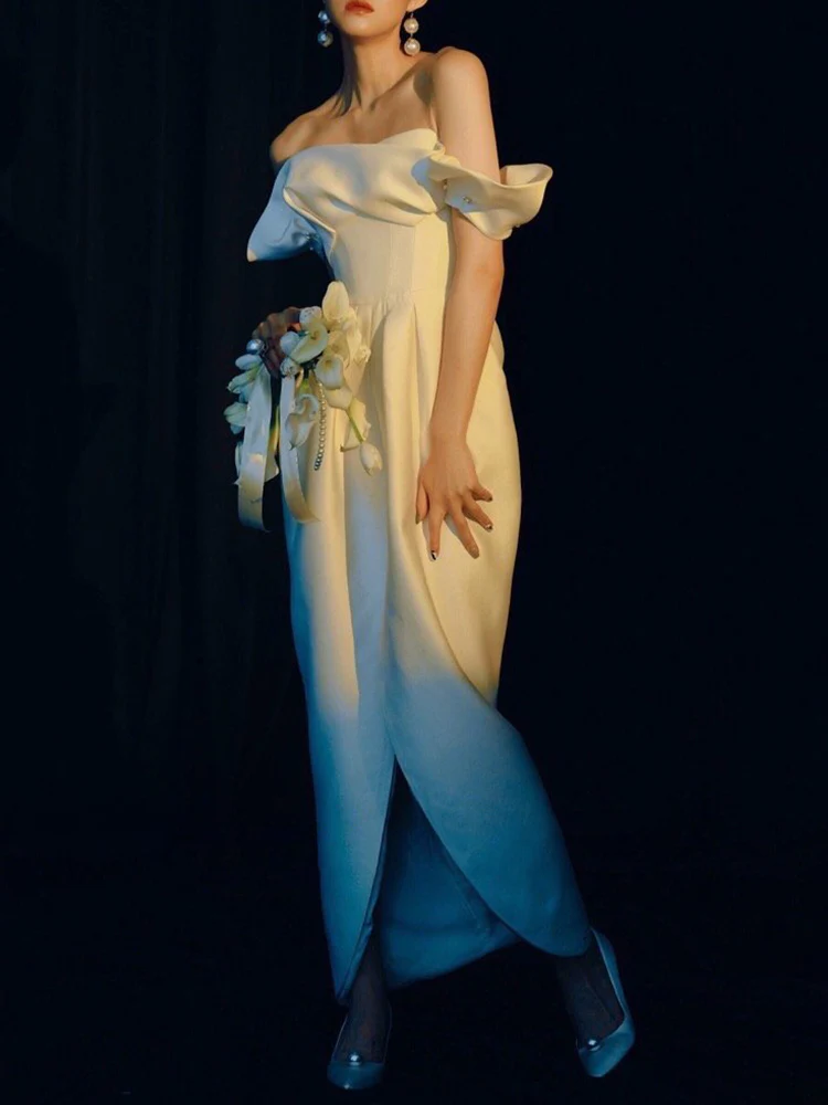 Unik bröllopsklänning med volangringning med överlappande kjol