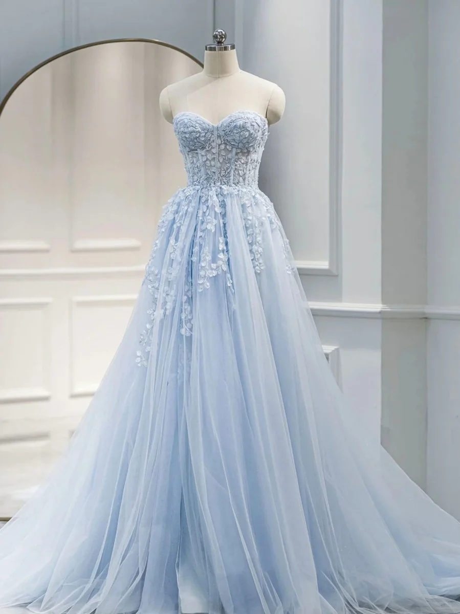 This beautiful blue tulle prom dress is a real showstopper, with a stunning sweetheart neckline and delicate lace details. The floor-length design is both elegant and sophisticated, making it perfect for formal events. The fitted bodice and full skirt are sure to turn heads, and the custom color options allow you to personalize the dress to your taste.
