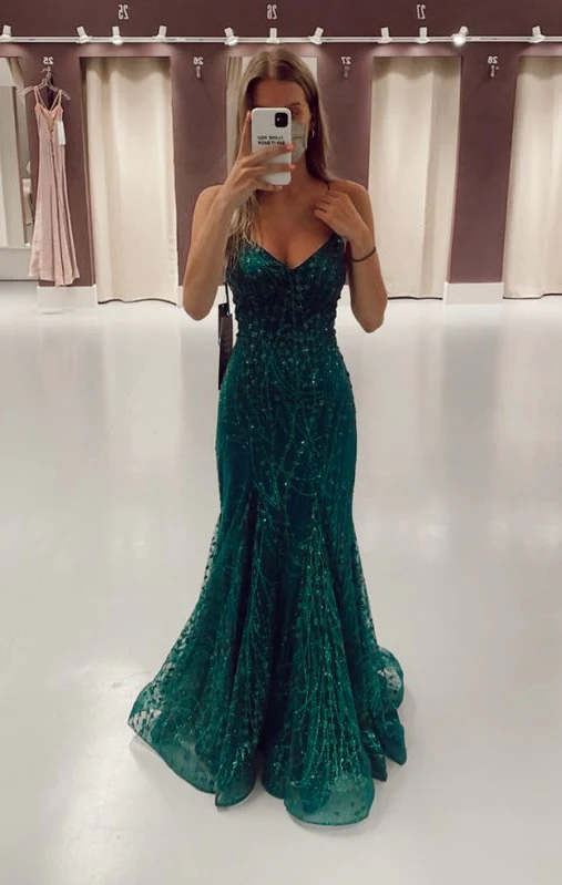 This gorgeous green mermaid gown is perfect for making a statement at prom or formal events. The sleeveless design and lace up back create a flattering and elegant look. With its floor sweeping train and mermaid silhouette, this dress is sure to turn heads. The stunning green color is both vibrant and sophisticated, making it ideal for anyone looking to make a fashion statement. Whether you’re attending a prom, wedding, or formal gala, this dress is sure to impress.