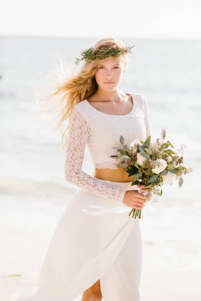 Casual långärmad rund hals Beach tvådelad bröllopsklänning
