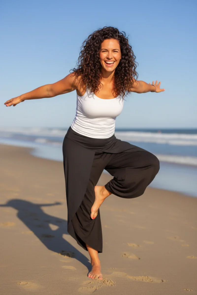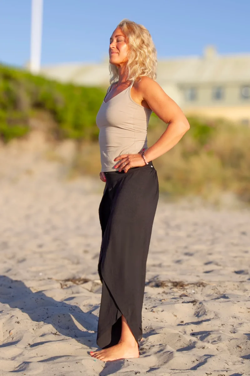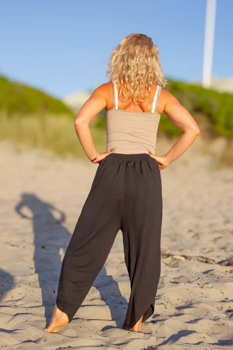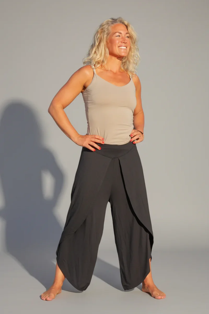 Elegant och sval byxa i silkesmjuk viskos. Lager av tyg och midjan har bred mudd framtill och resår baktill.