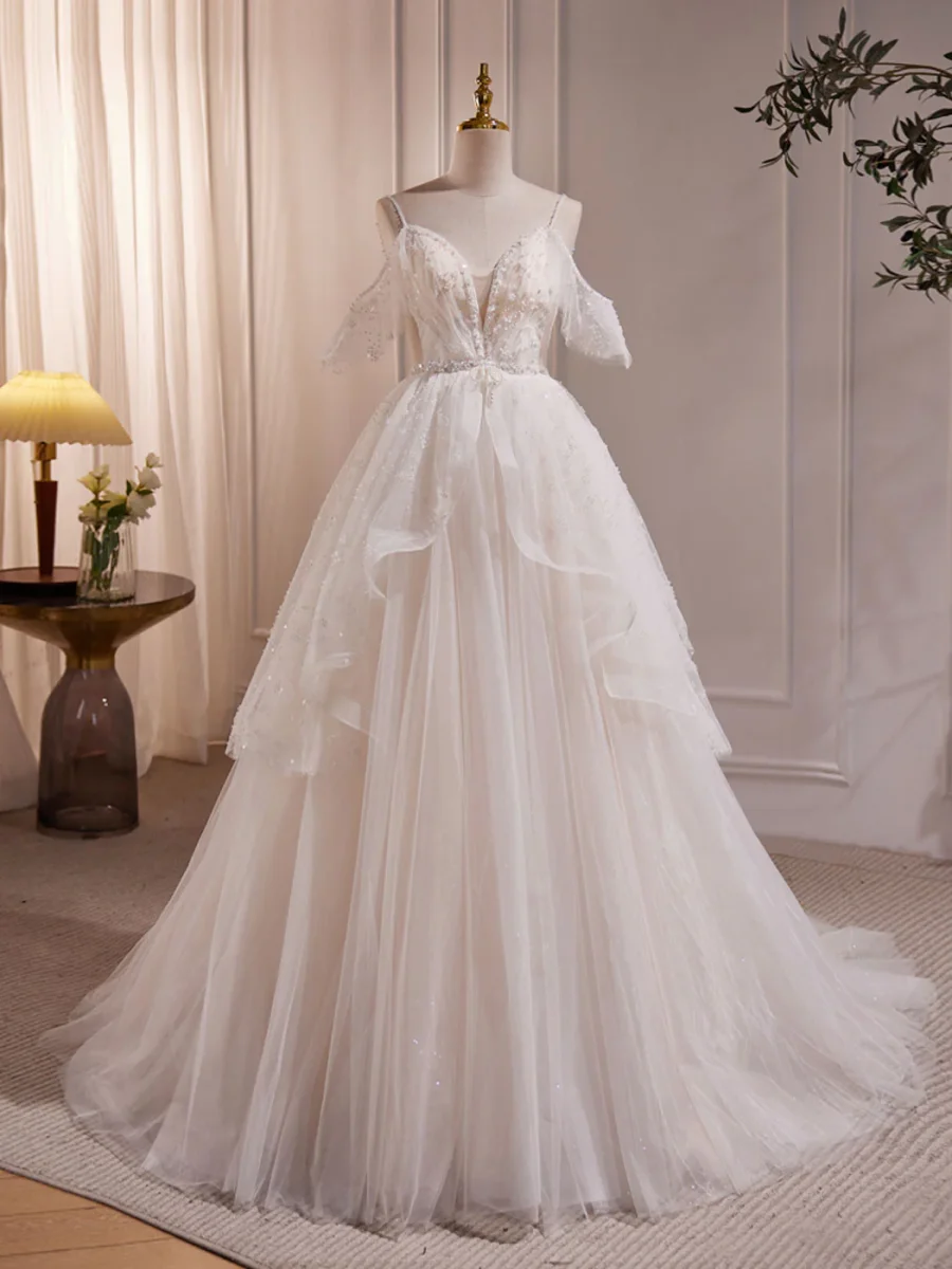 White A-line Tulle Beading Long Prom Dress, Beige Formal Dress