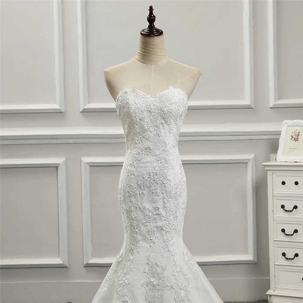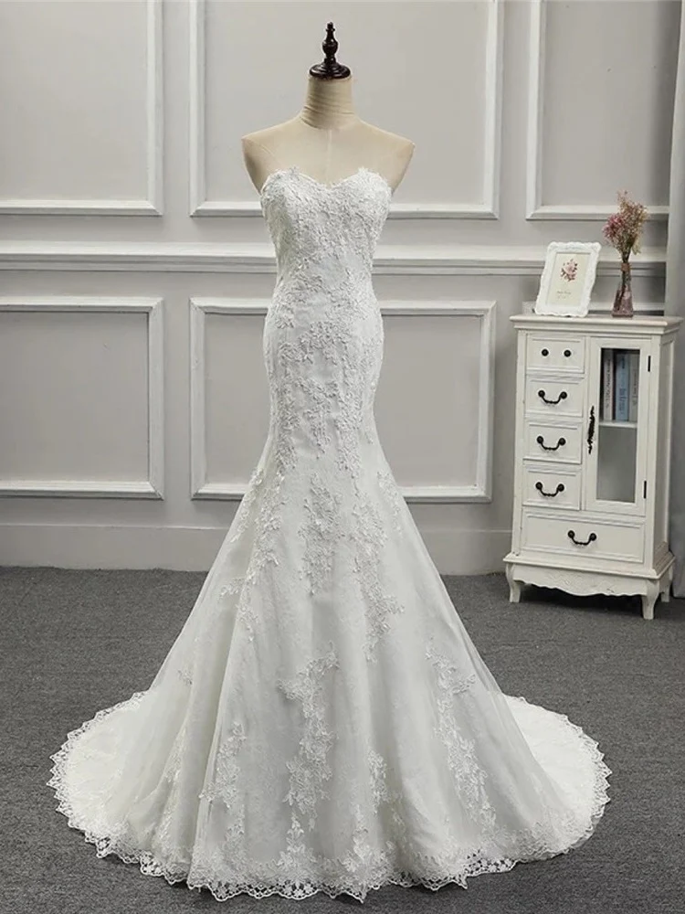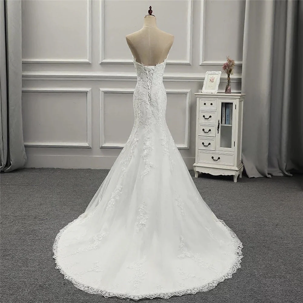 Klassisk spetsapplikat trumpetbröllopsklänning