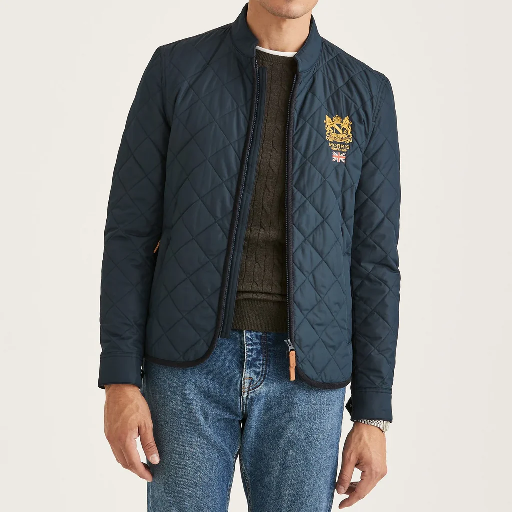 En quiltad jacka att bära under vår och höst, och ibland även en blåsig sommardag. Morris Trenton Quilted Jacket är det perfekta sättet att addera någon elegant (inklusive klassiska manchesterdetaljer) till en mer modern citylook. Framsidan pryds av ett Morris-emblem tillsammans med två fickor med dolda tryckknappar. Vi har också inkluderat en innerficka, eftersom vi vet att de flesta män gillar gott om förvaringsutrymme i sina ytterkläder. Jackan har en normal passform och stängs med en tvåvägsdragkedja.