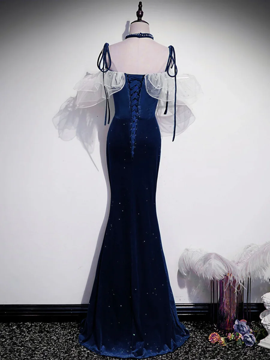 Mörkblå sjöjungfru sammet långa balklänningar, blå festklänning
