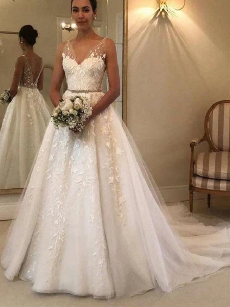 Dröm A-linje V-hals Chapel Train Bröllopsklänning