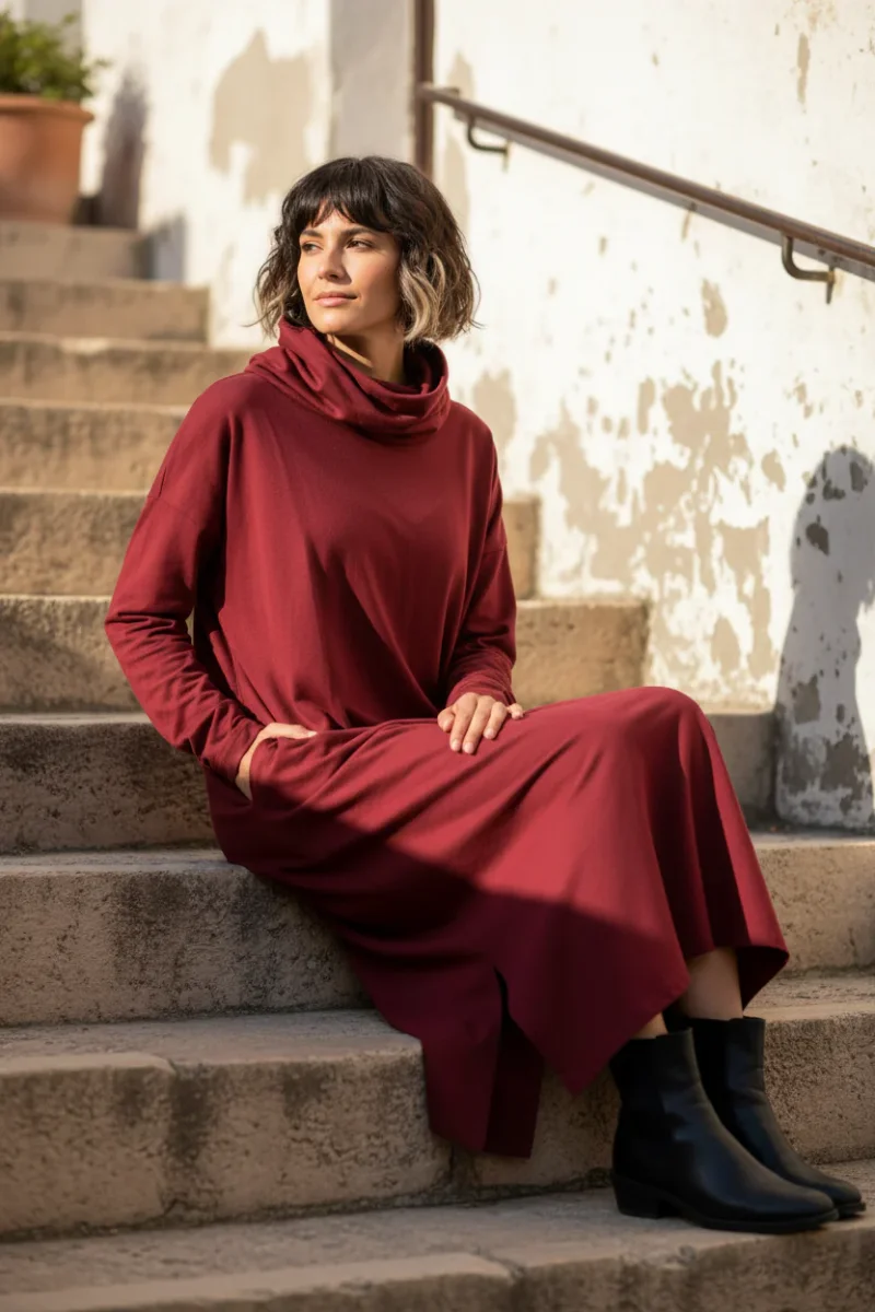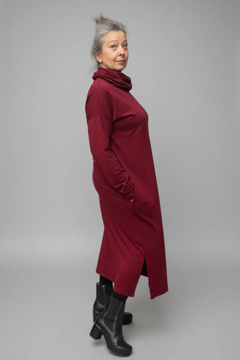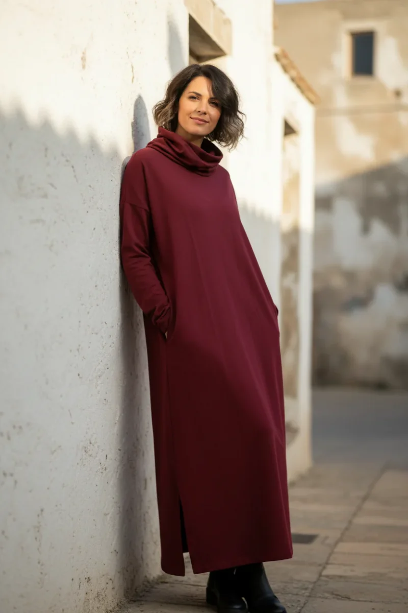 Suveränt snygg och bekväm långklänning med härlig polokrage. Polo Kaftan Dress är en av våra stora favoriter! Nu kommer denna sköna poloklänning i en mjuk och stretchig ekologisk bomull. Klänningen har en avslappnad passform med en lös och ledig polokrage och långa ärmar. Naturligtvis är den försedd med fickor!