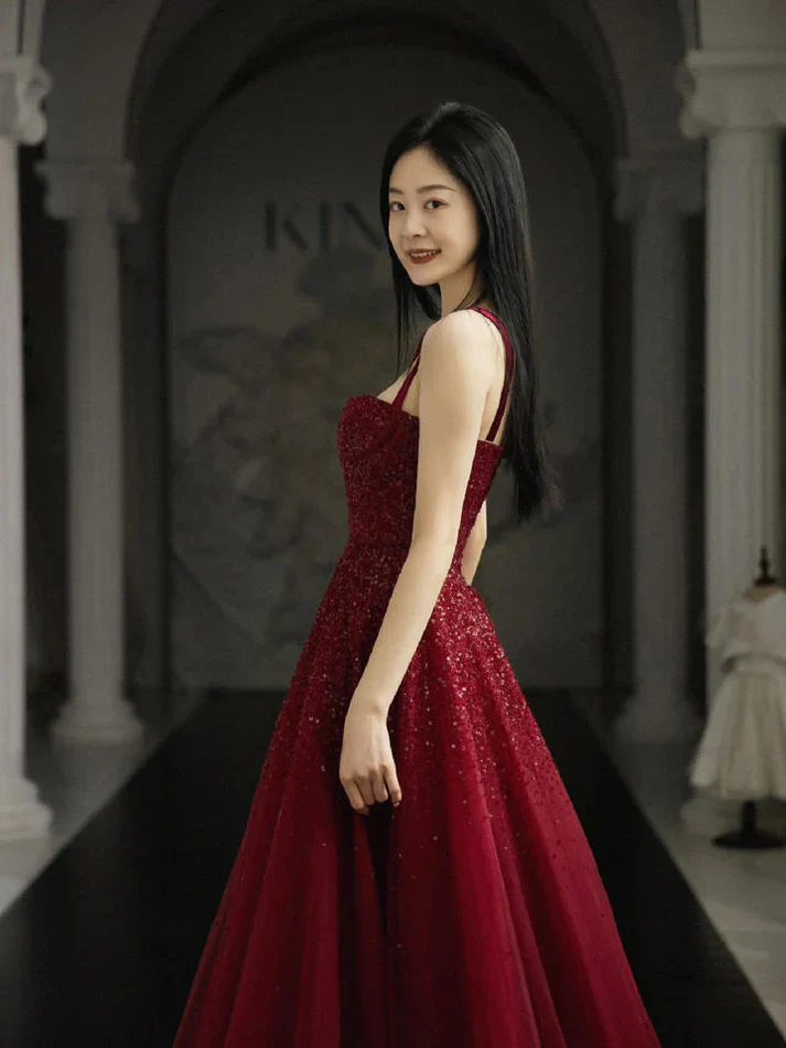 Mjuk vinröd tyll formar en smickrande A-linjeformad siluett som ger volym utan vikt. Snörning baktill och inbyggd BH ger justerbart stöd och en smidig passform. Ärmlösa axelband och lager på lager av tyll ger graciös rörelse, perfekt för bal, homecoming eller kvällsevenemang. Anpassad storlek finns tillgänglig på begäran.