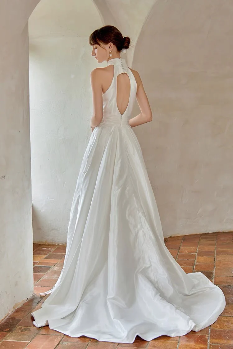 Asymmetrisk slits grimma hals öppen rygg siden bröllopsklänning