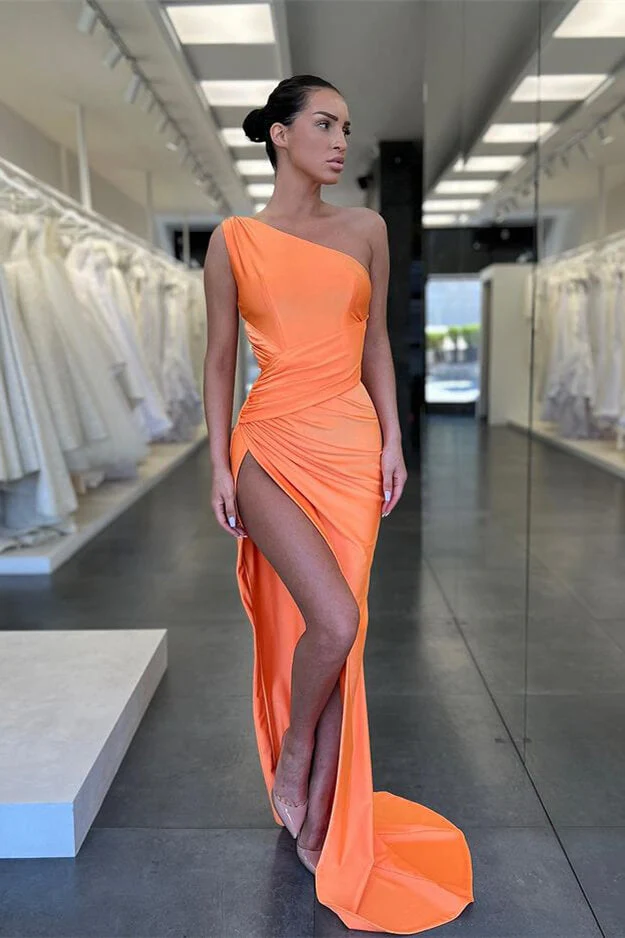 Dazzle at your next special event in this vintage inspired prom dress! The vibrant orange hue and flattering mermaid silhouette will ensure all eyes are on you. The one shoulder design adds a touch of elegance, while the high slit provides a hint of allure. Crafted with meticulous pleats, this dress is a dream come true!