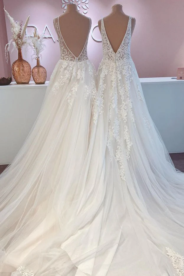 Say ’yes’ to this dress! This A line wedding dress features wide straps, an open back, and delicate lace appliques. The tulle train adds a touch of romance and drama, perfect for your special day. Whether you choose a standard size or custom measurements,our tailors craft each dress to order.